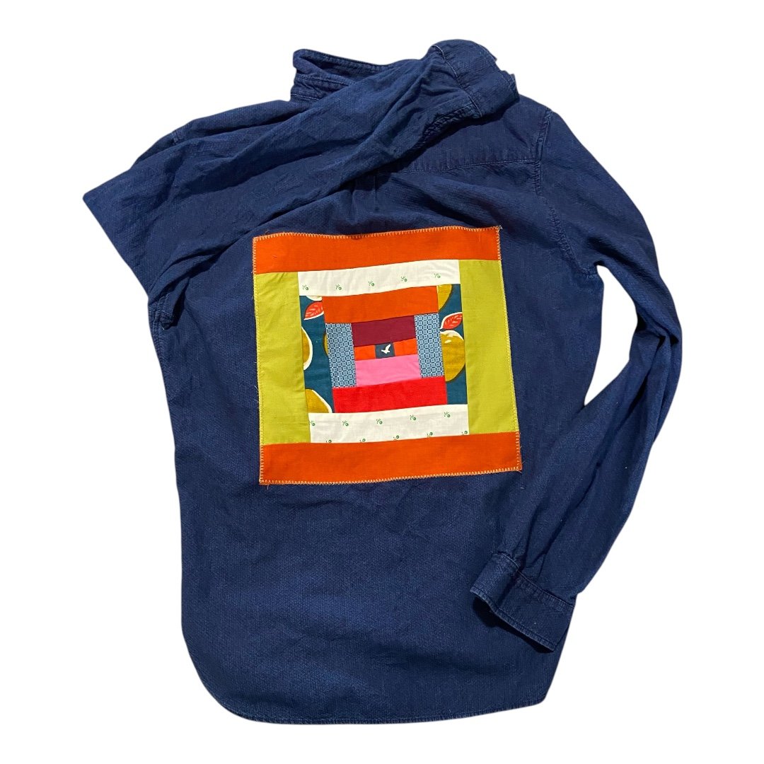 Upcycled shirt appliquéd with a unique log cabin quilt square.