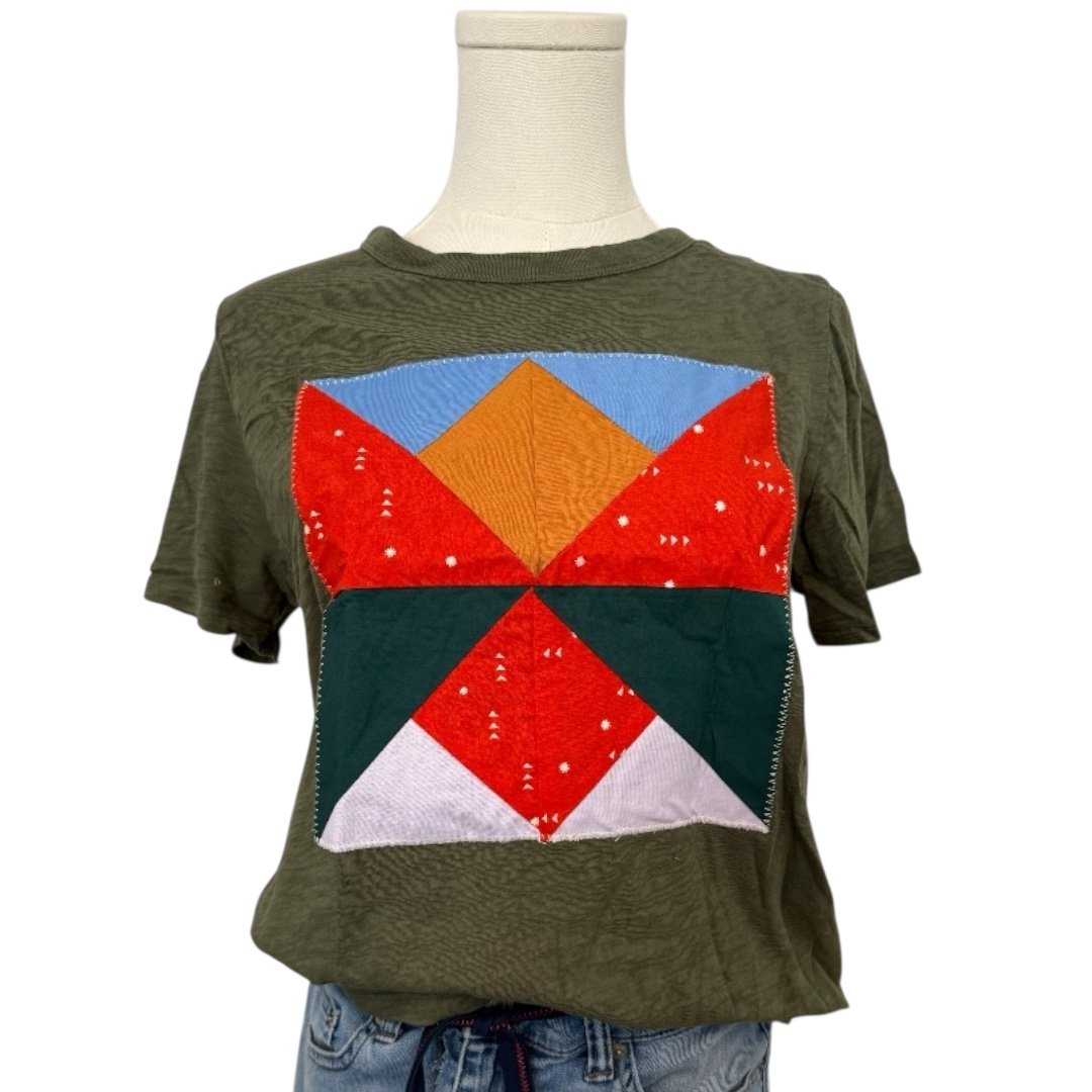 Upcycled t-shirt appliquéd with a unique quilt square.