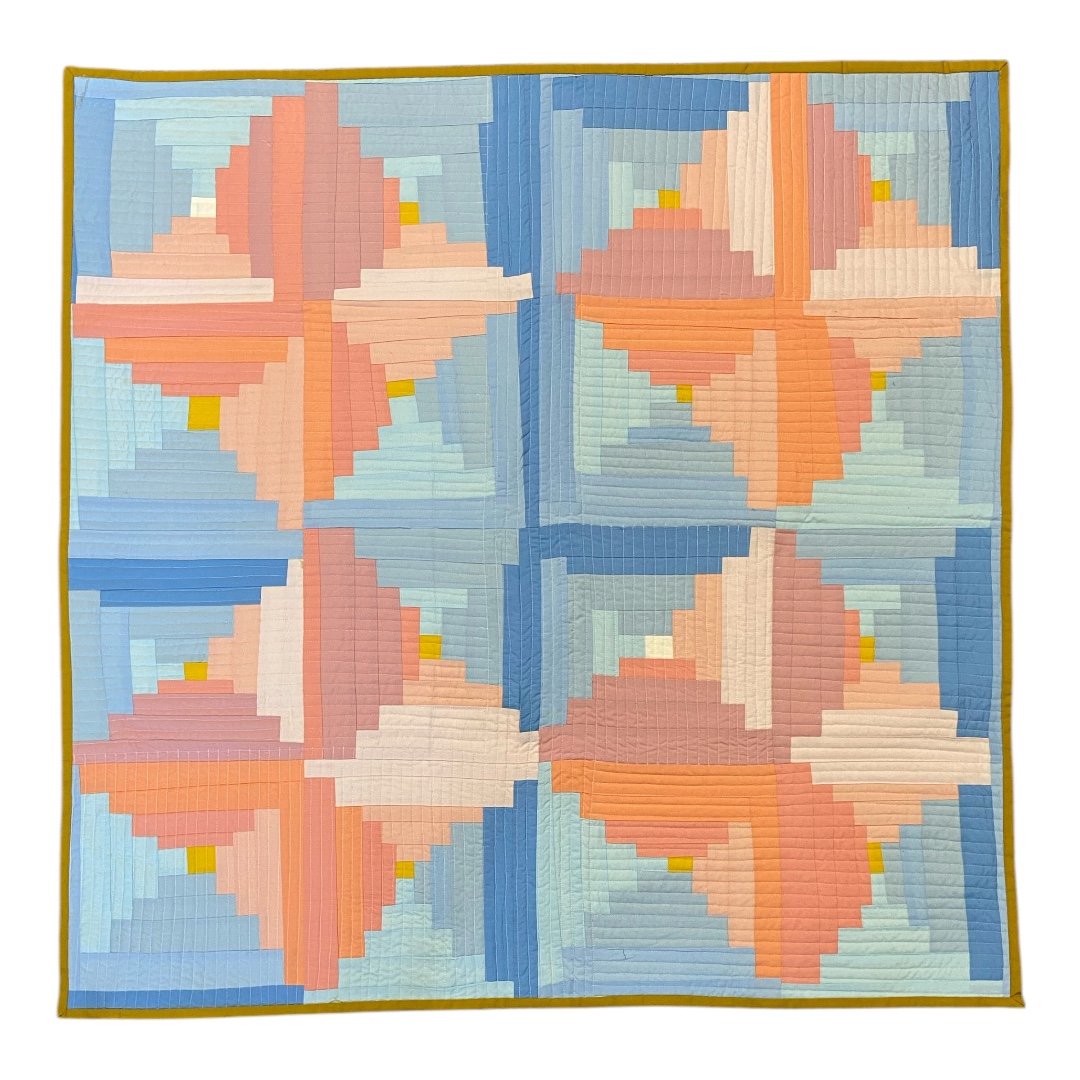 This traditional log cabin design is machine pieced and quilted, ready to hang on the wall or drape on a side table or the back of a chair.