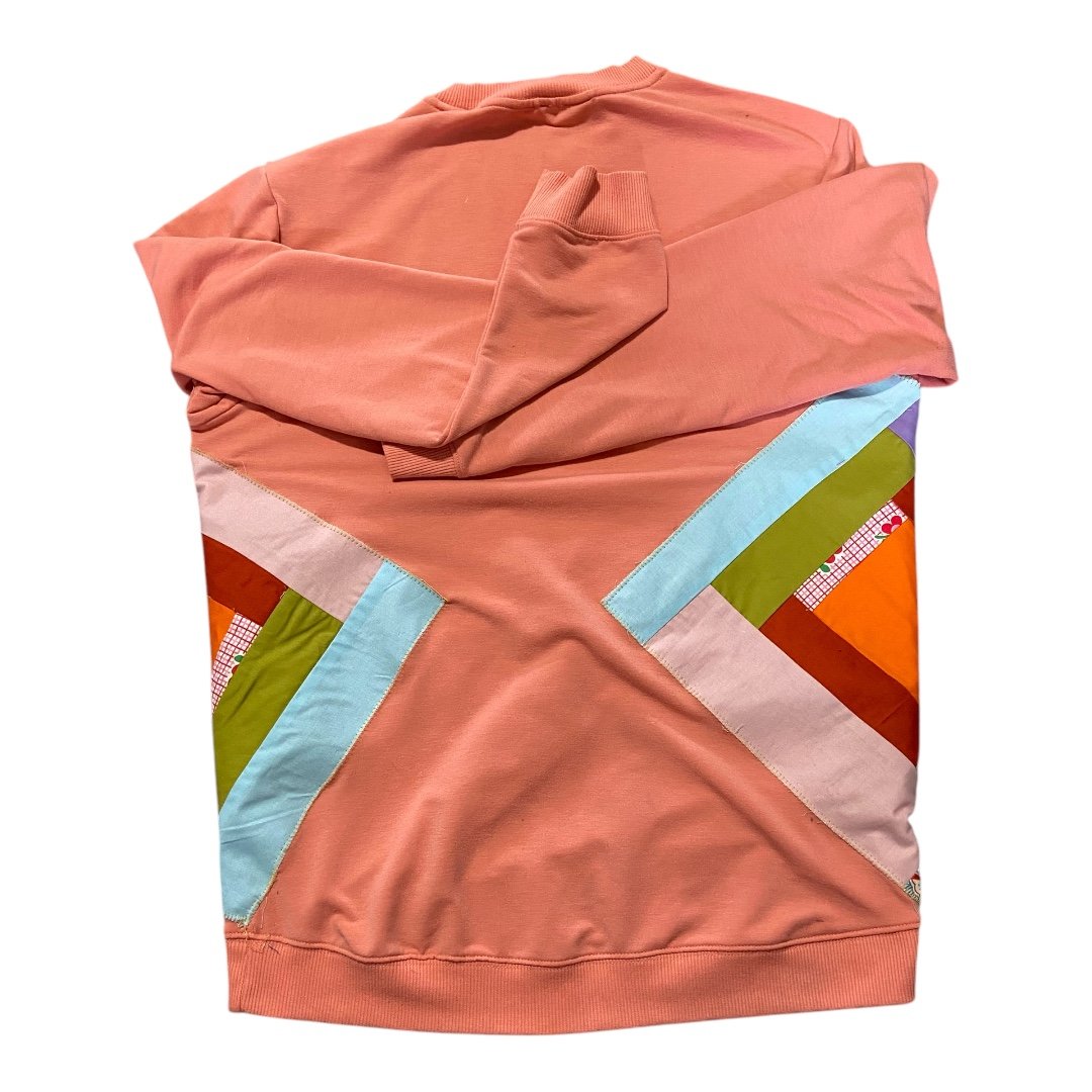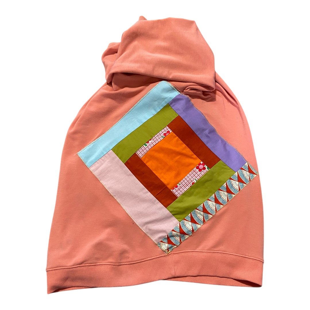 Upcycled sweatshirt appliquéd with unique log cabin quilt squares.