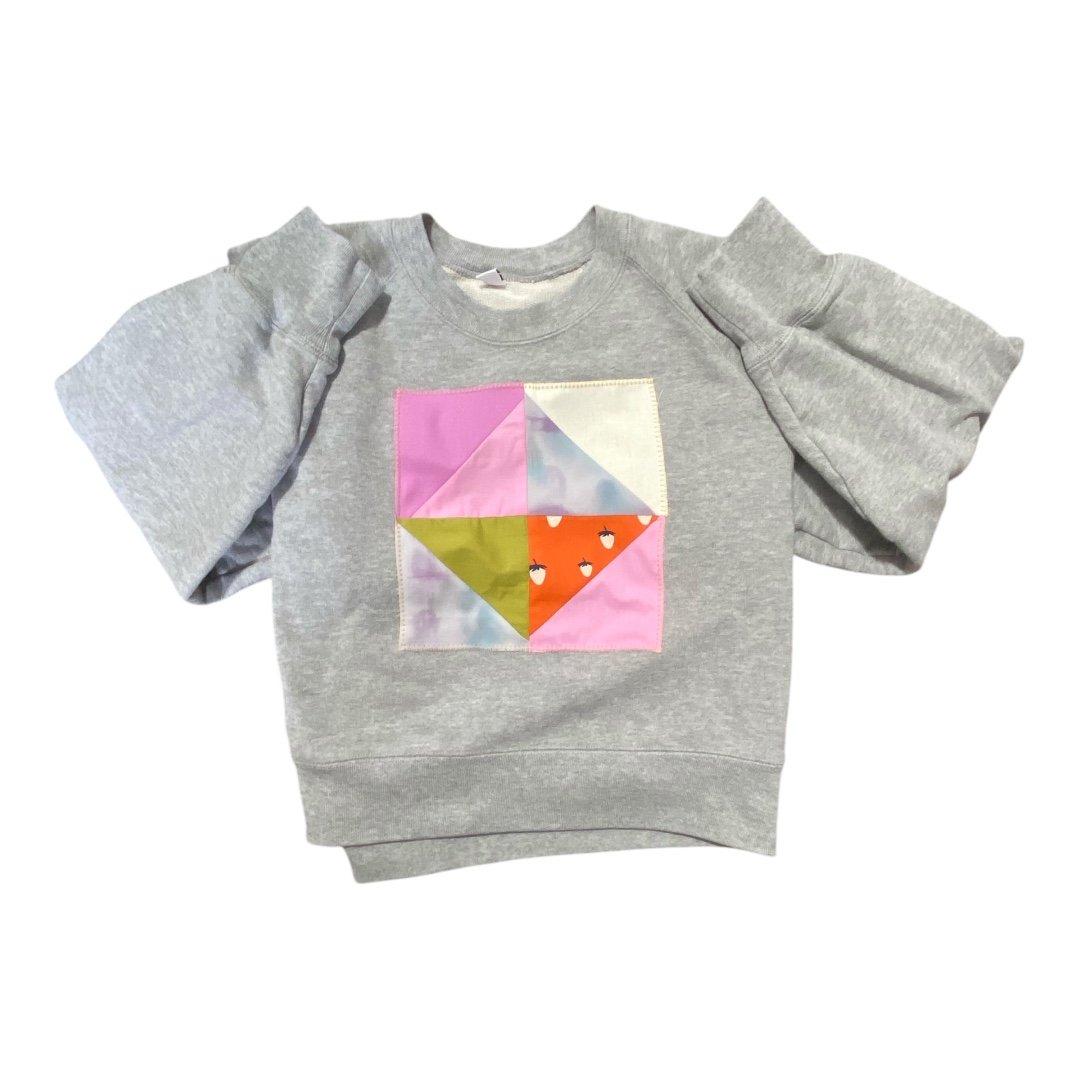 Upcycled sweatshirt appliquéd with a unique diamond patch quilt square.