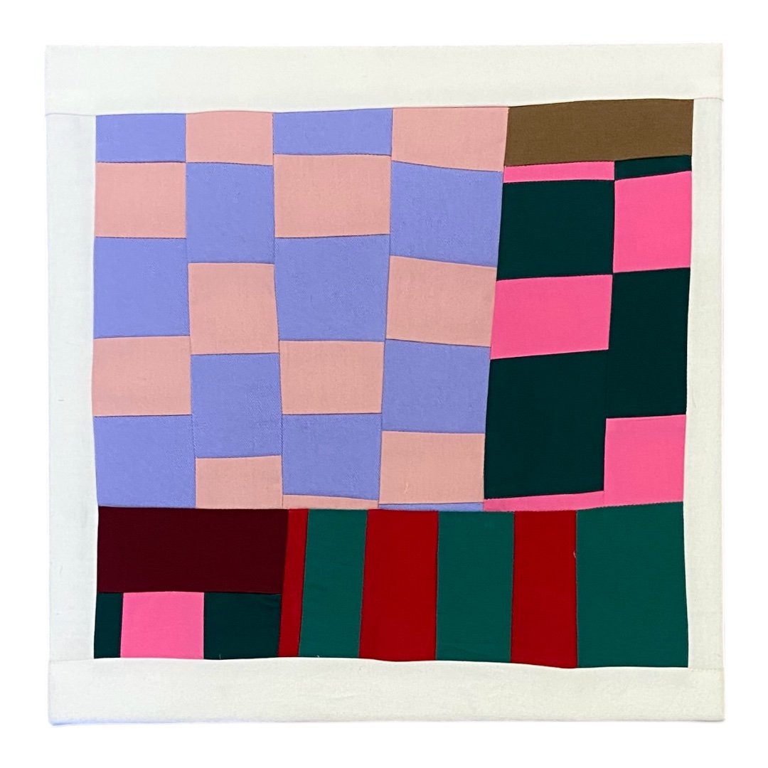 Machine pieced fabric stretched on a 14 x 14 in. canvas. This “fabric painting” is ready to hang on the wall and brings a pop of cheery color to any corner. These pieces look great in combination with others, you can build your own quilt design on your wall!