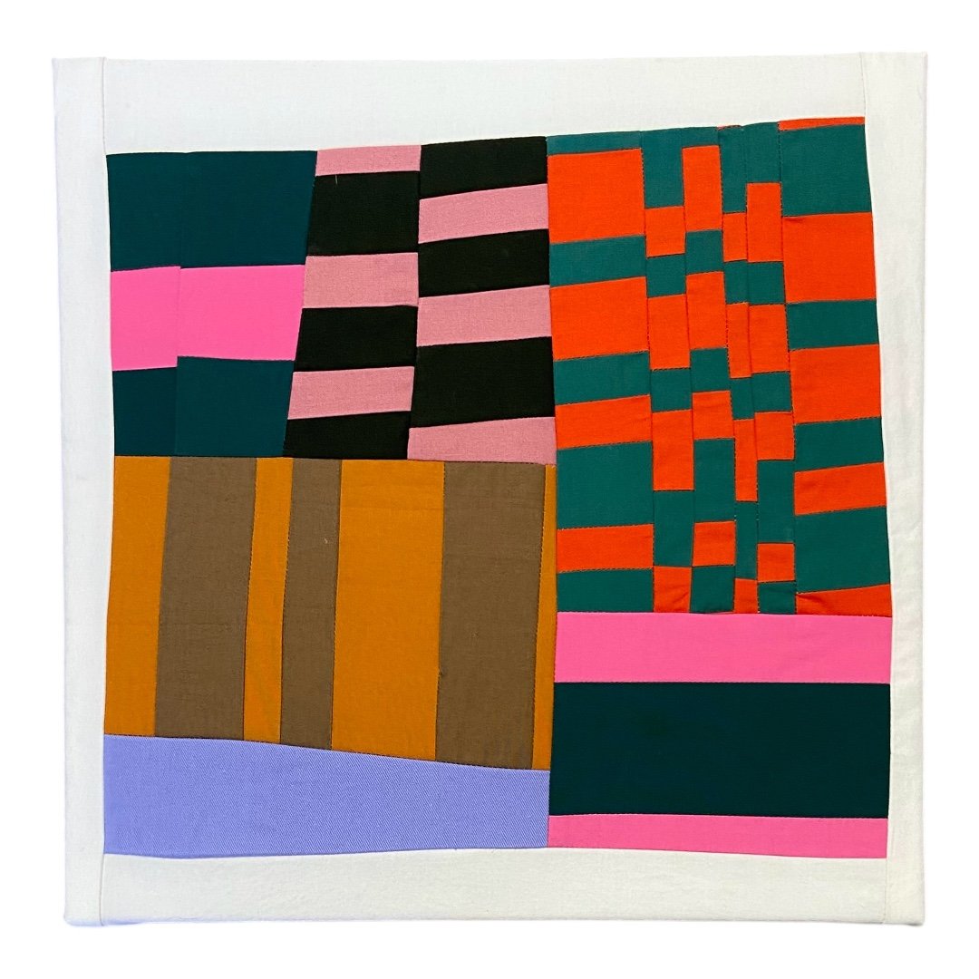 Machine pieced fabric stretched on a 14 x 14 in. canvas. This “fabric painting” is ready to hang on the wall and brings a pop of cheery color to any corner. These pieces look great in combination with others, you can build your own quilt design on your wall!