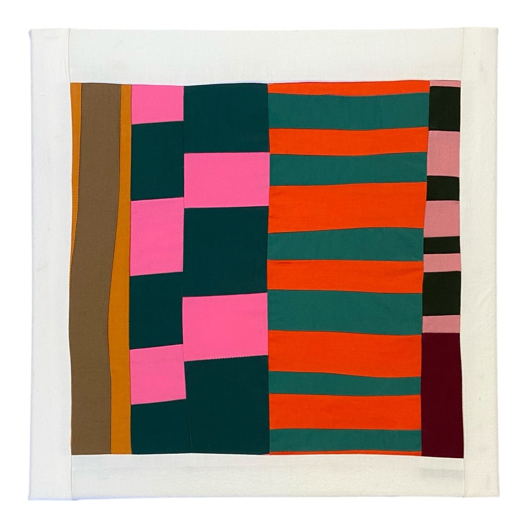 Machine pieced fabric stretched on a 14 x 14 in. canvas. This “fabric painting” is ready to hang on the wall and brings a pop of cheery color to any corner. These pieces look great in combination with others, you can build your own quilt design on your wall!